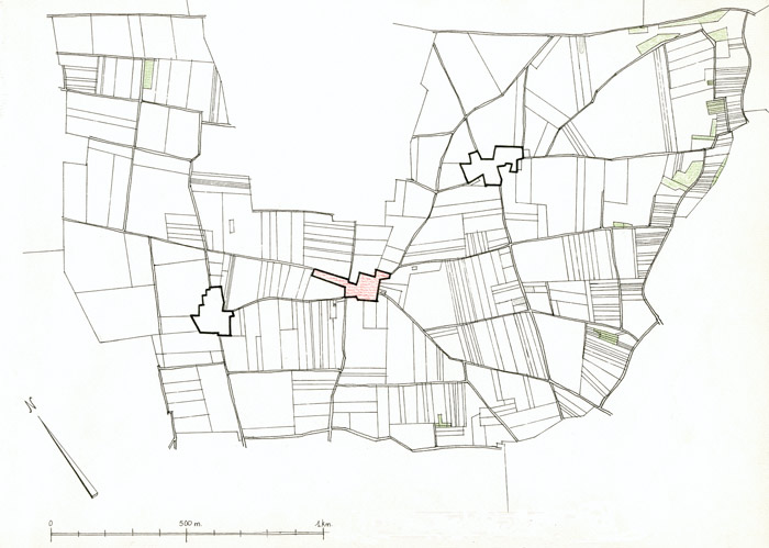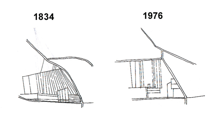 Toujours en comparant les deux plans de la commune (1839 et 1976) on remarque dans l'ancien plan une zone d'environ 100 à 200 mètres autour du noyau du village ; celà correspond à la culture intensive (jardins, vergers). Dans le plan de 1976, ces zones sont rares et parfois inexistantes.