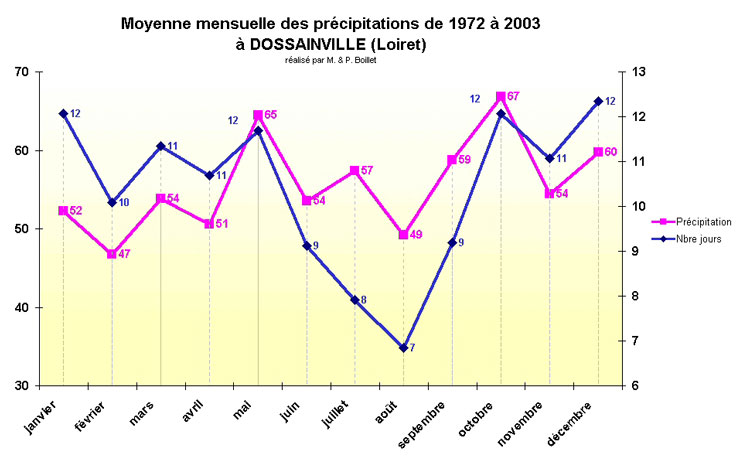 La courbe bleue représente le nombre de jours de précipitations (échelle de droite en nombre de jours) ; la courbe rose représente la quantité de précipitation (échelle de gauche en mm.).
