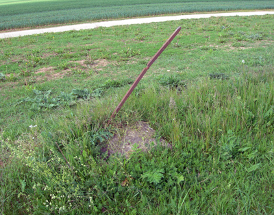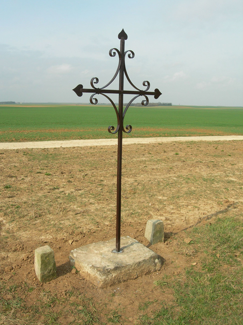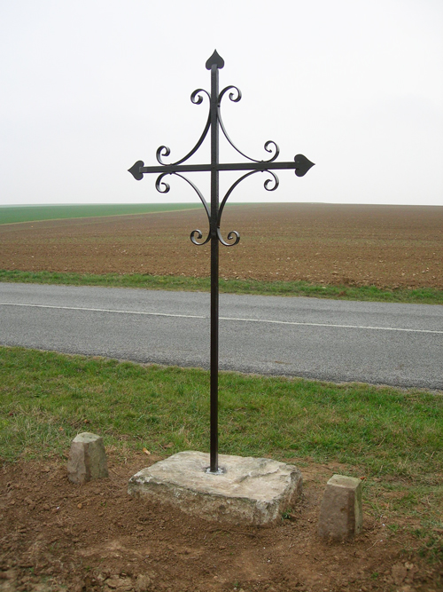 Croix en fer forgé dressée sur un socle de pierre avec emmarchement sur le chemin de terre de Dossainville à Formarville