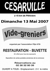 Nous avons eu un temps idéal pour ce 4e vide-greniers qui s'est déroulé sur la place de Césarville-Dossainville. Une trentaine d'exposants et de nombreux visiteurs à la recherche de l'objet indispensable et repartant avec un objet coup de coeur ! Exposition de photos des manifestations organisées par l'Association L'EPI D'OR dans la commune de 2007 à 2010 : photos de classes, cartes postales anciennes de la commune (en vente auprès de l'association L'EPI D'Or).