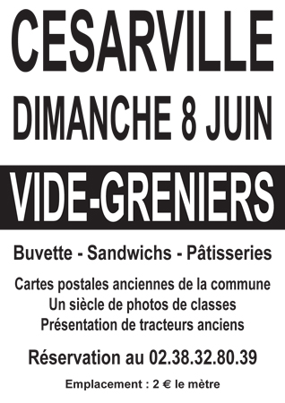 Excellent cru pour ce vide-greniers 2016 qui s'est déroulé cette année à CESARVILLE. Temps couvert, mais une consolation avec les nombreuses pâtisseries réalisées par les bénévoles de la commune.
